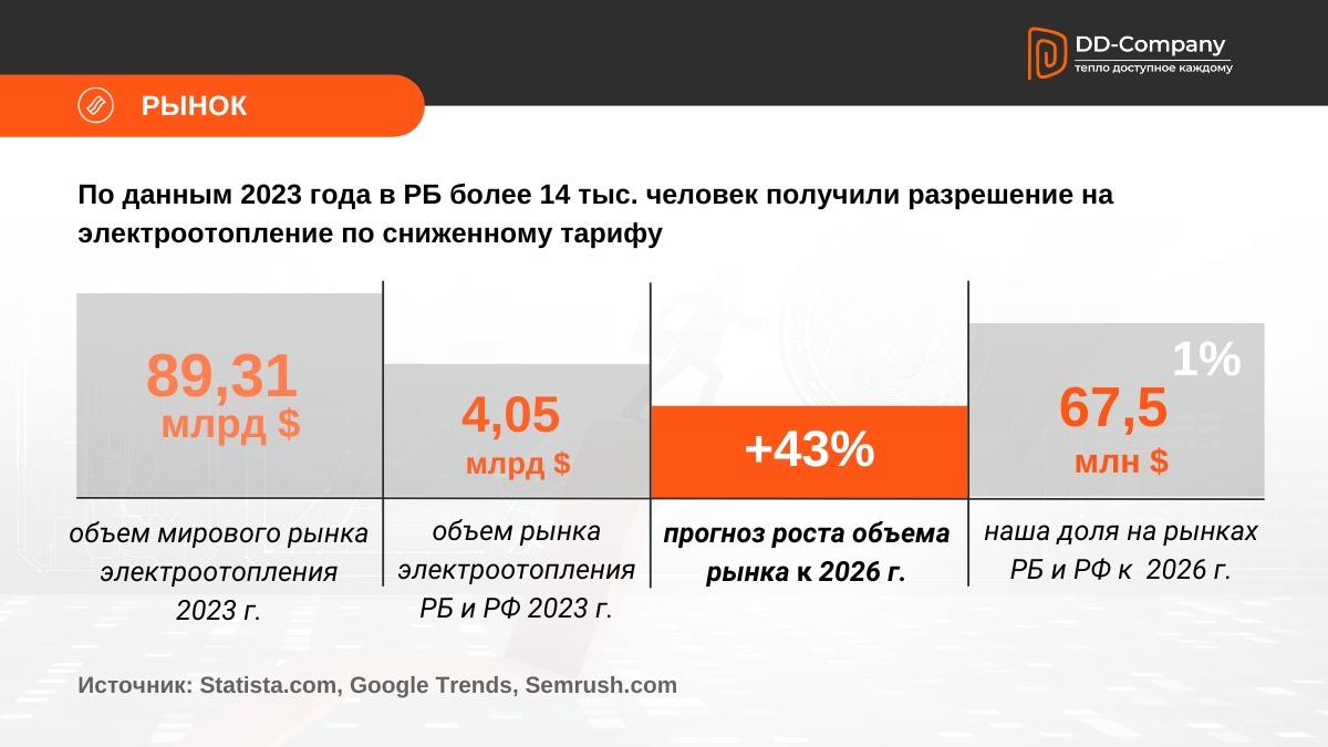 Технология, опережающая время. Мировой рынок систем энергоутилизации тепла от вычислительных процессов (в том числе майнинга и дата-центров) оценивается в миллиарды долларов и растёт на 15–20% в год. В Беларуси и СНГ рынок отопления частных домов и малых предприятий — стабильно растущий, при этом альтернатива газу и дровам востребована как никогда. DD-Crypto объединяет два направления в одном решении — и занимает новую, незанятую нишу, в которой нет прямых конкурентов. При этом сочетает: